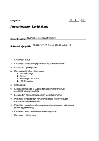 Pidetään 29. huhtikuuta kello 17.30 alkaen hotelli Scandic City kokoustilassa Ounas. Osoitteessa Koskikatu 23 Rovaniemi.